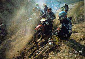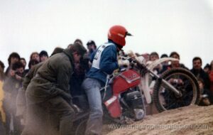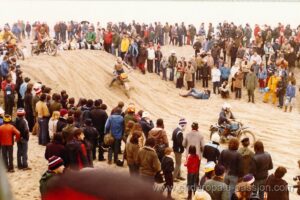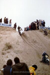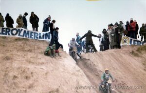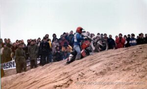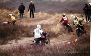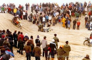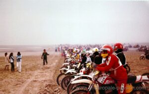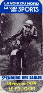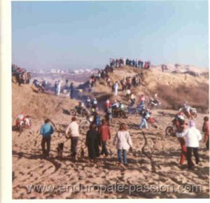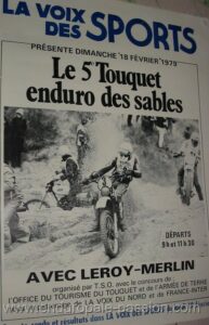 Nous avons été 4 dans les 50 premiers Gentlemen : moi 6ème, Néron 8ème, Danovsky 22ème et Weilenmann 46ème (mon patron, qui était venu en avion). On continue avec le témoignage de Bernard Leleu leleu.bernard62@orange.fr : Voici quelques photos de mon premier Touquet en 1979. Les copains me poussent à faire cette course, mais il y a seulement un an et demie que je fais de la moto et 6 mois du tout terrain ! Inscrit sur une 125 Suzuki RMB il y avait 2 départs (encore plus stressant) la RM ne roulait qu’a 80 KM/H sur cette plage interminable jusqu’à Stella Plage, ensuite des dunes, une partie de marais et voilà qu’apparait la fameuse dune de MAY VILLAGE impossible à franchir pour certains et la descente..? Ravitaillement à chaque tour (cause petit réservoir), pour le pilote aussi, bien que roulant sur un 125 je termine 104 éme et premier du Moto Club Berckois ! Superbe course, à l’année prochaine et… merci Thierry ! |