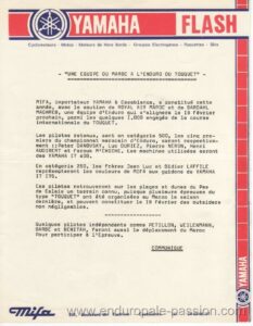 Nous commençons cette année 1979 avec le récit d’Henri Audiberthenri.audibert@neuf.fr qui nous expose ici sa deuxième participation : La meilleure ! Voici les photos de ma participation en 1979. Nous sommes venus d’Agadir au Maroc pour courir : plus de 6000km aller retour en Ford Transit (emprunté à un épicier !) avec 5 motos et 4 pilotes (le 5ème venait en avion) Le communiqué de Yamaha Maroc que vous pouvez lire ci-dessous ( et que j’ai moi-même écrit) : tout est presque vrai, mais le sponsoring était symbolique et mes copains les Laffilé roulaient en fait sur une Husky et une Montesa. Le résultat fut au-delà de tous nos espoirs : Scratch :